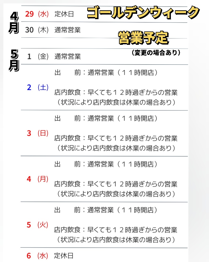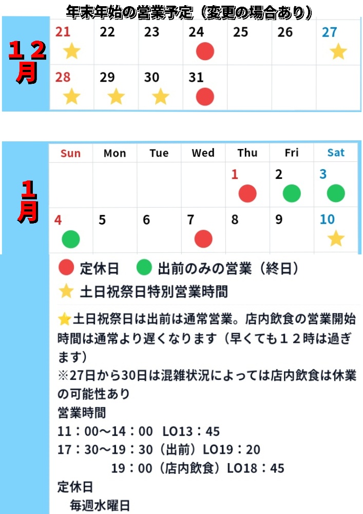 | 営業方法 | ・平日:出前、店内飲食共に通常営業 ・土日祝:出前は通常営業 店内飲食の開店時間は平日より遅くなります(早くても営業開始は12時は過ぎます。日によって変動しますので要電話確認) ※年末年始、GW、お盆は終日、出前のみ |